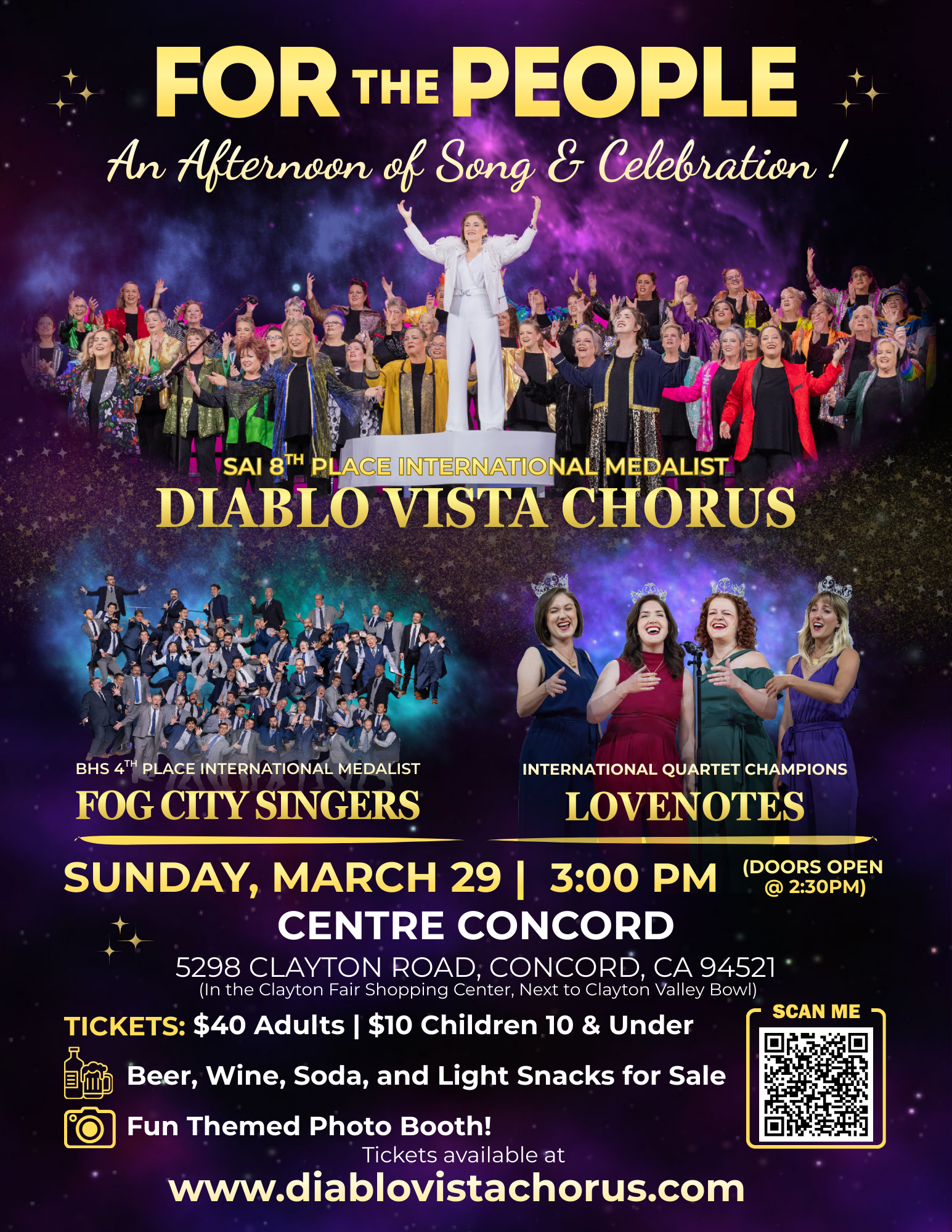 3:00pm, Sun, Mar 29 2026Diablo Vista Chorus presents “For the People-An Afternoon of Song and Celebration” with: LoveNotes Quartet (2014 Sweet Adelines International Champion Quartet 'Queens of Harmony') Fog City Singers (2025 Barbershop Harmony ... more